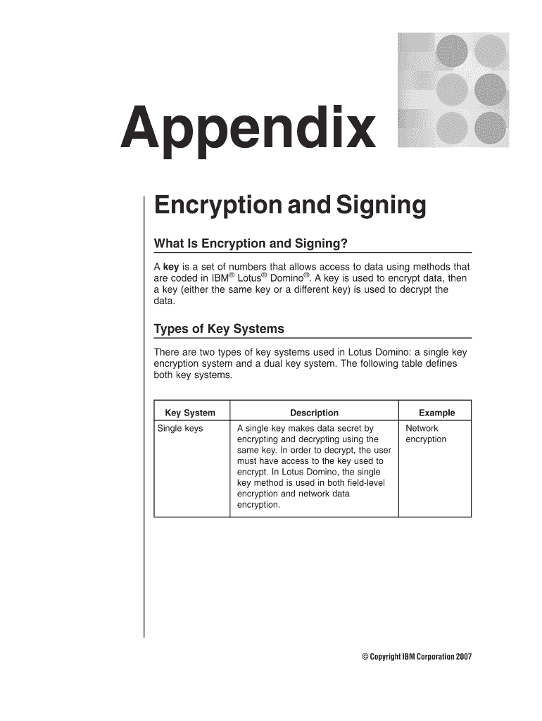 Appendix B Encryption and Signing What Is Encryption and Signing? A key is a set of numbers that allows access to data using methods that are coded in IBM Lotus Domino. A key is used to encrypt data,