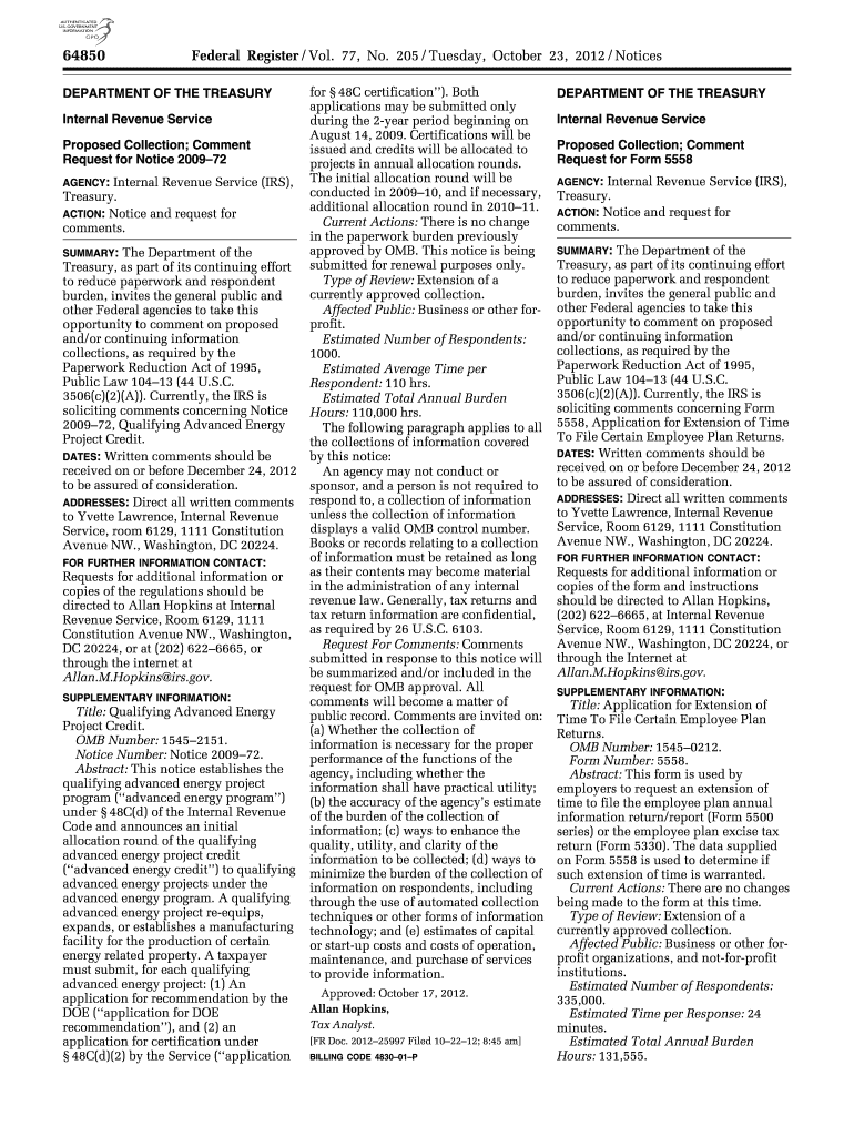 64850 Federal Register / Vol. 77, No. 205 / Tuesday, October 23, 2012 / Notices DEPARTMENT OF THE TREASURY Internal Revenue Service Proposed Collection; Comment Request for Notice 200972 Internal