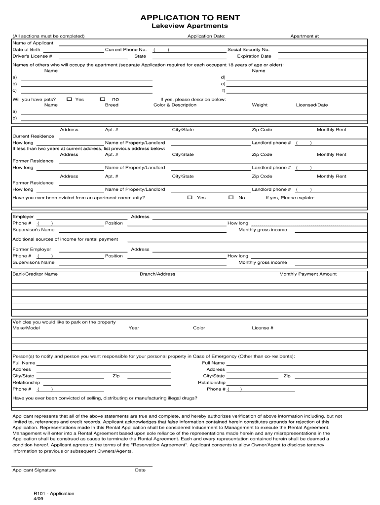 This document is an application form for potential tenants seeking to rent an apartment, requiring personal information, employment history, and acknowledgments regarding the rental agreement.