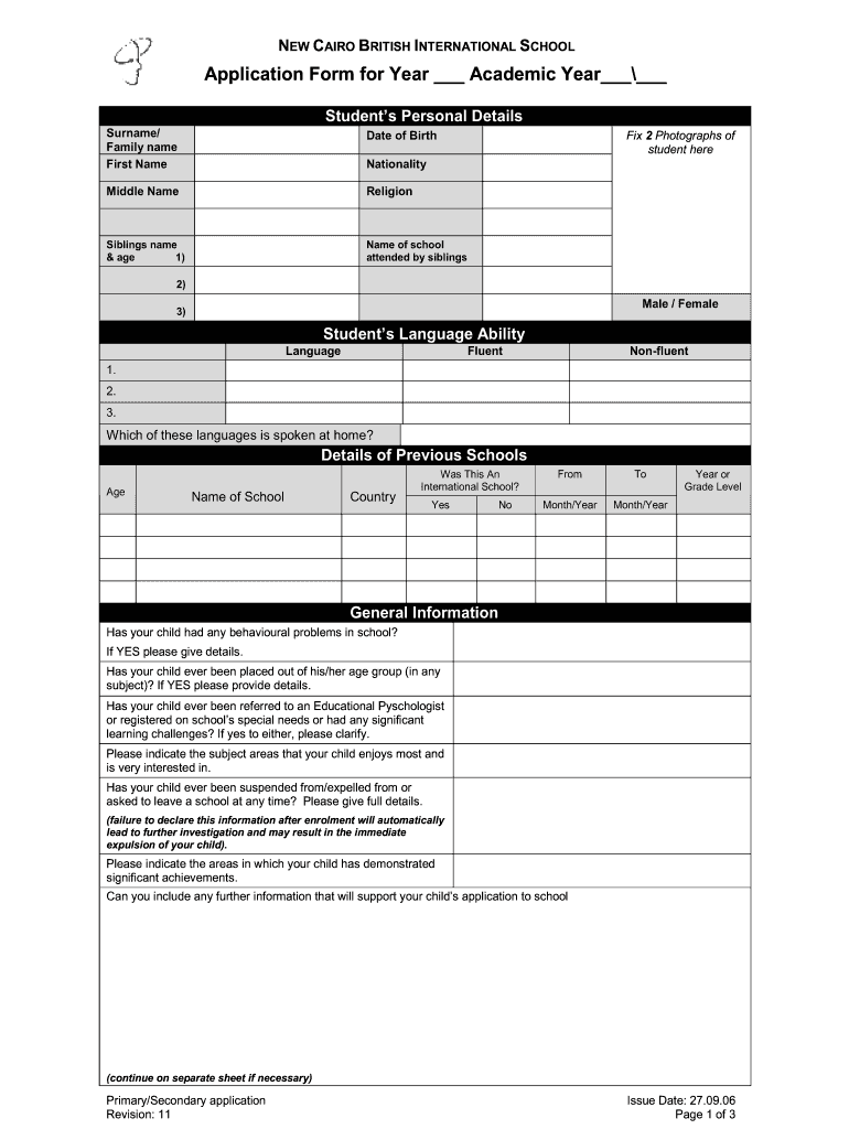 NEW CAIRO BRITISH INTERNATIONAL SCHOOL Application Form for Year Academic Year Student s Personal Details Surname/ Family name First Name Date of Birth Middle Name Religion Siblings name & age 1)