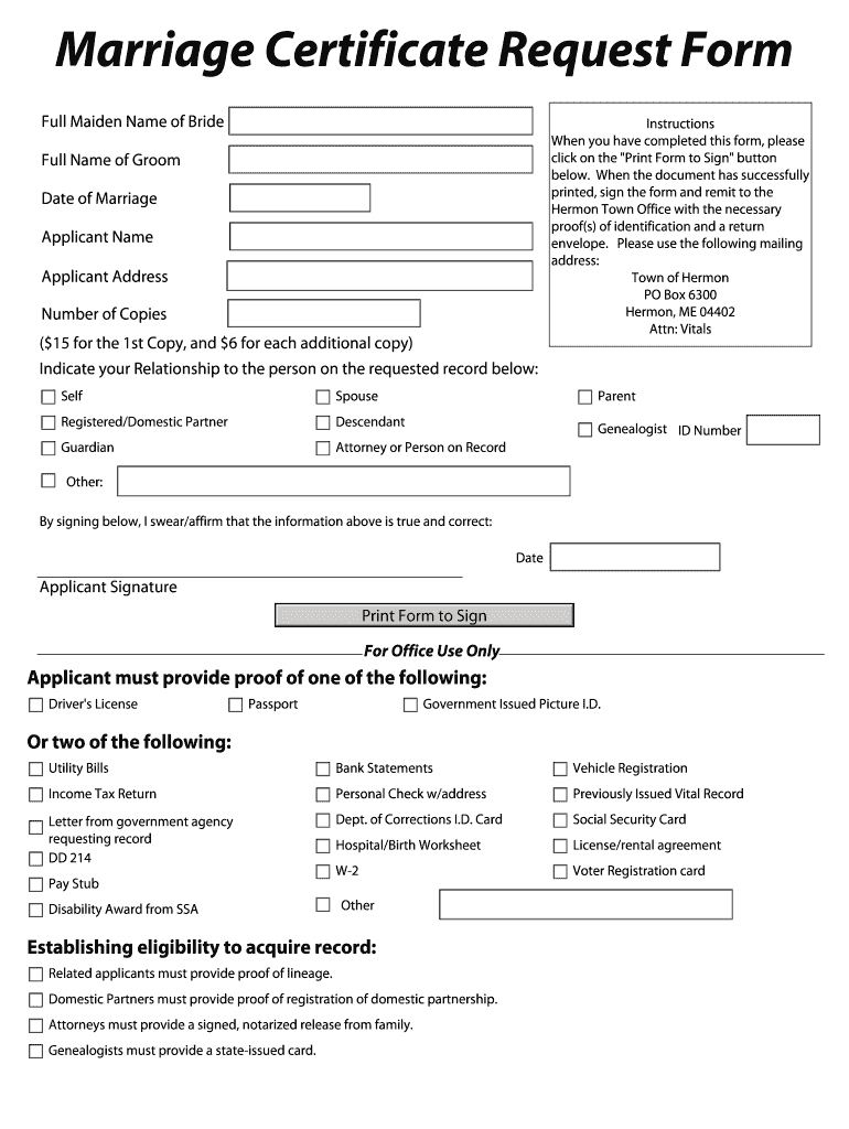 This form is used to request a marriage certificate from the Town of Hermon, requiring personal information, proof of identification, and relationship to the person on the record.