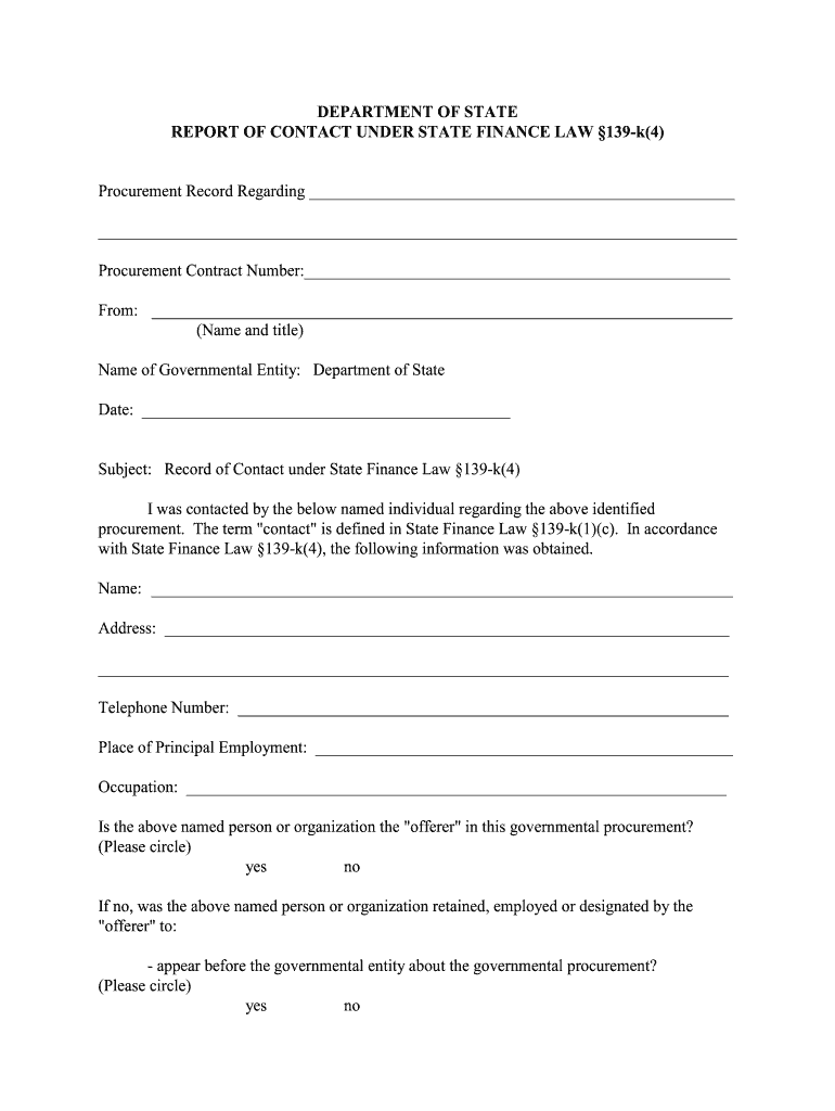 How to fill out REPORT OF CONTACT UNDER STATE FINANCE LAW §139-k(4)?