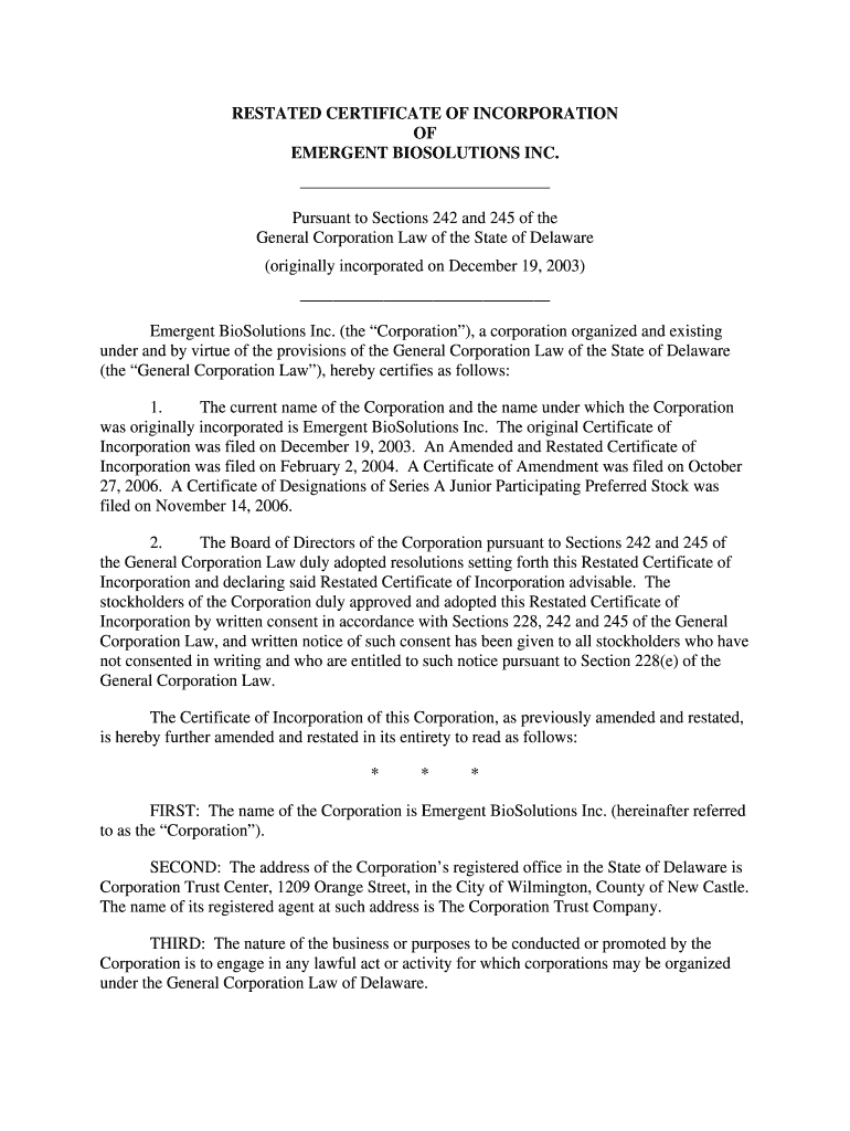 This document certifies the Restated Certificate of Incorporation of Emergent BioSolutions Inc., including the history of its incorporation, amendments, and provisions concerning stock and corporate