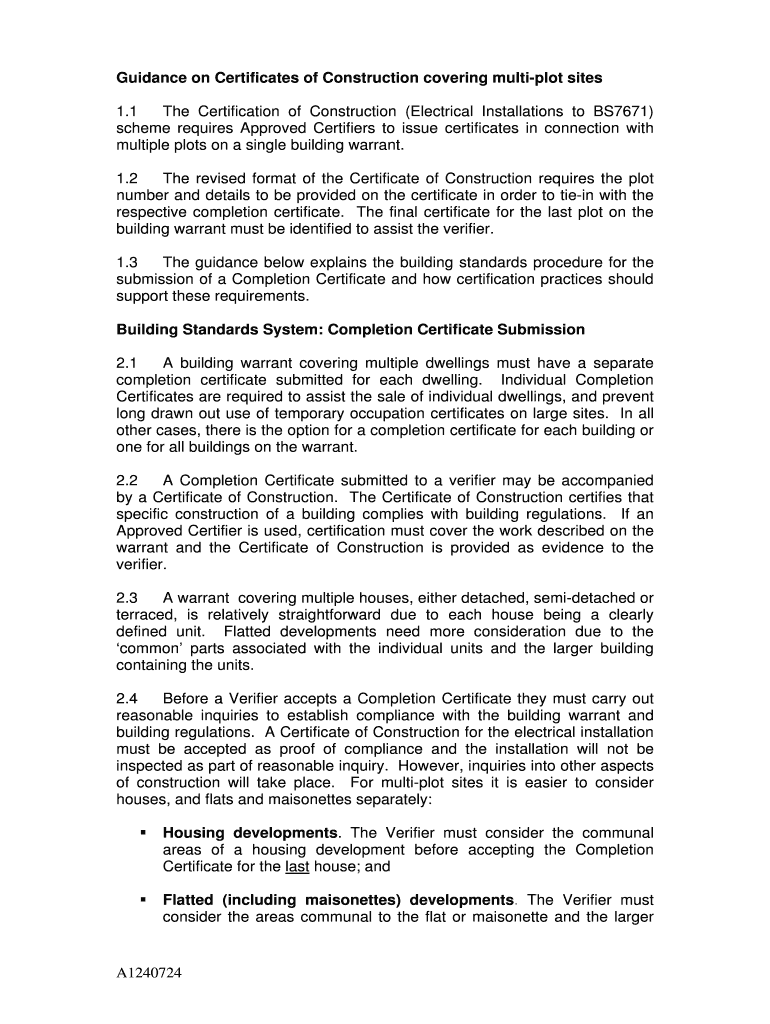 This document provides guidance on the Certification of Construction scheme for electrical installations and outlines the procedure for submitting Completion Certificates for multiple plots under
