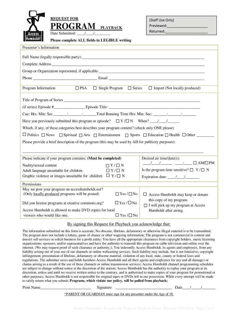 This document allows Humboldt residents to submit programs for playback on Access Humboldt TV channels and the online Community Media Archive, while outlining the programming policies and submission