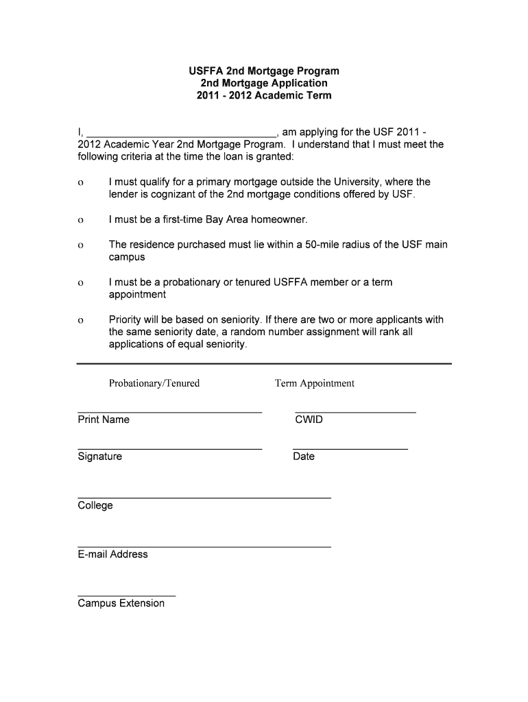 This document serves as an application for the USF 2011-2012 Academic Year 2nd Mortgage Program, outlining eligibility criteria and submission instructions.