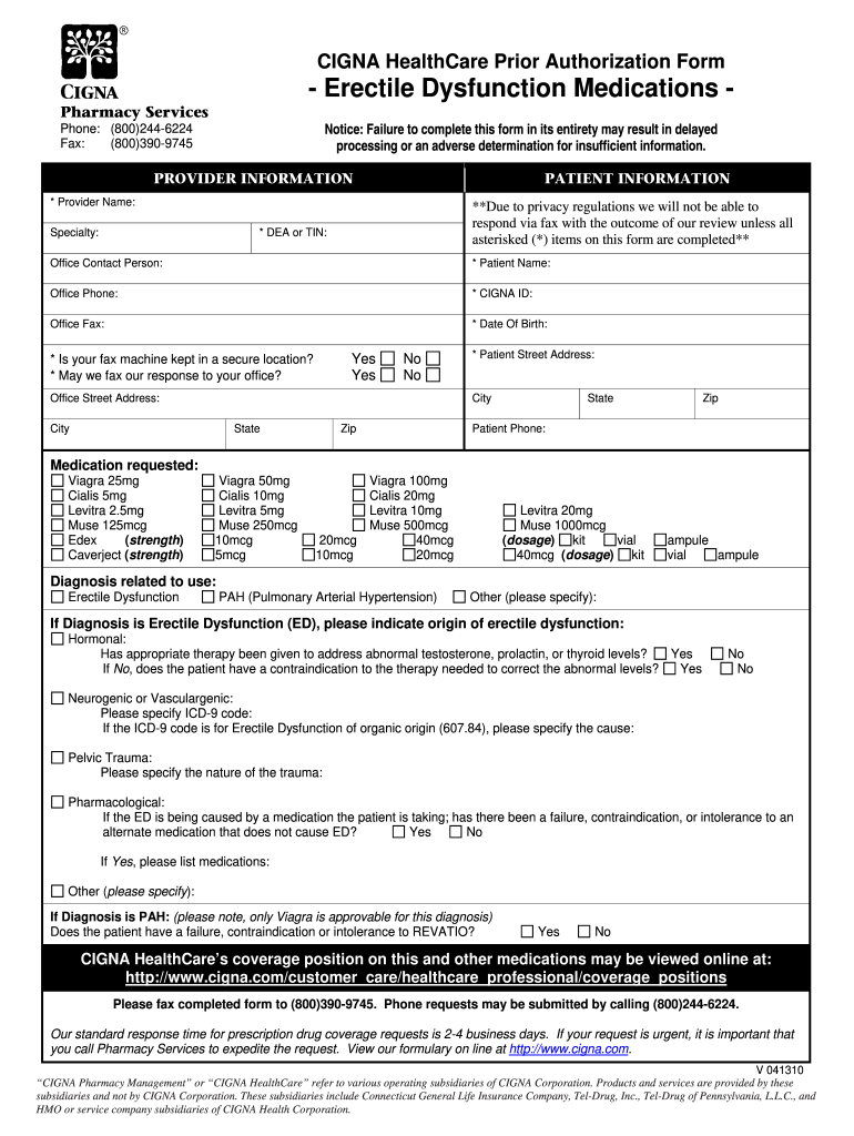 CIGNA HealthCare Prior Authorization Form - Erectile Dysfunction Medications Pharmacy Services Notice Failure to complete this form in its entirety may result in delayed processing or an adverse determination for insufficient information. Phone 800 244-6224 Fax 800 390-9745 PROVIDER INFORMATION PATIENT INFORMATION Provider Name Specialty Due to privacy regulations we will not be able to respond via fax with the outcome of our review unless all as...