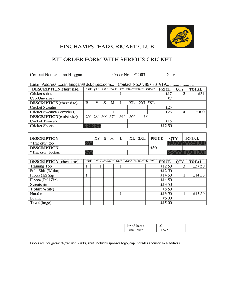 Obtain the KIT ORDER FORM from the Serious Cricket website or your team coach.