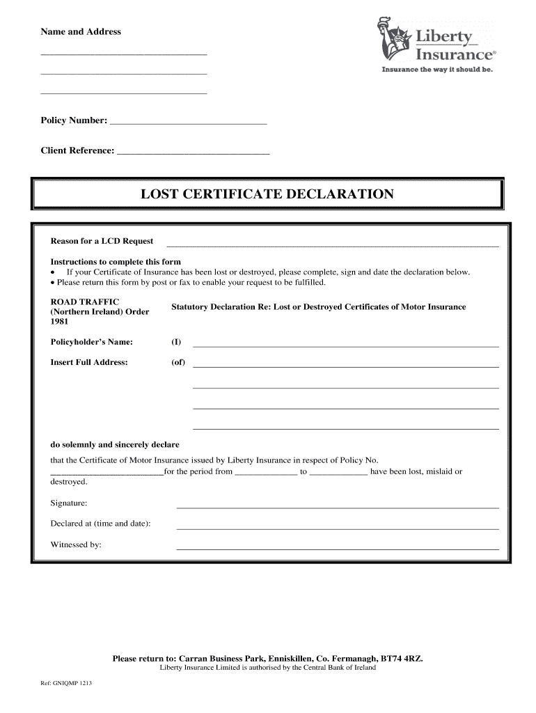 This form is primarily designed for policyholders of Liberty Insurance in Northern Ireland who have lost their Certificate of Motor Insurance.