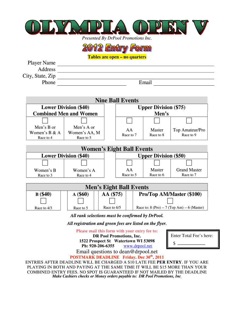 This document is a registration form for various billiards events organized by DrPool Promotions Inc., including Nine Ball and Eight Ball championships for different skill levels. Participants can