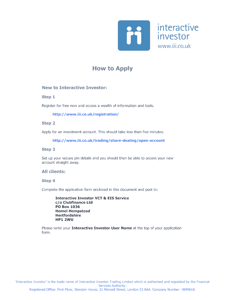 How to Apply New to Interactive Investor: Step 1 Register for free now and access a wealth of information and tools. http://www.iii.co.uk/registration/ Step 2 Apply for an investment account. This