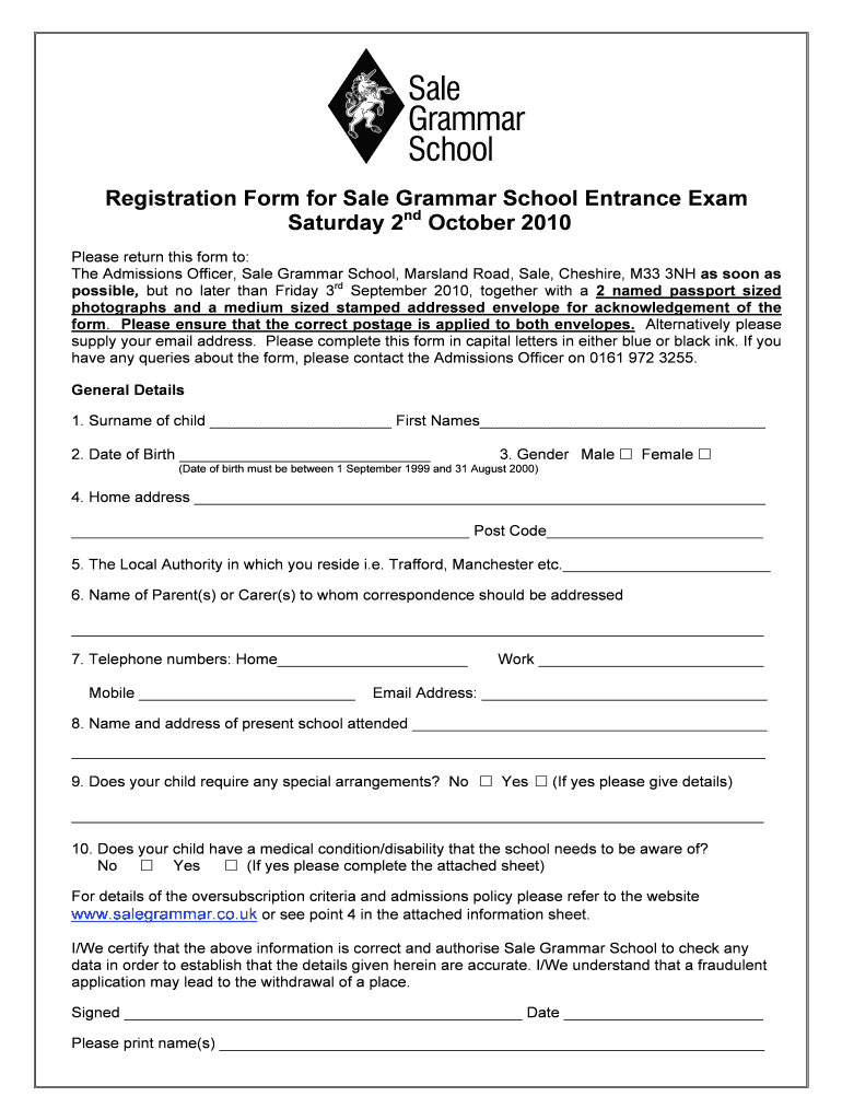 This form is used for registering a child for the Sale Grammar School Entrance Exam, providing necessary personal details, and certifying the accuracy of the information submitted.