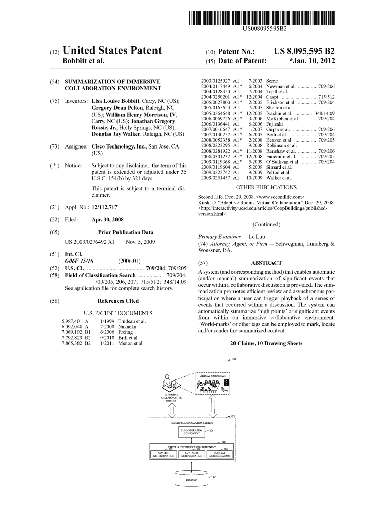USOO8095595B2 (12) United States Patent (10) Patent N0.: Bobbitt et a . (45) Date of Patent: (54) SUMMARIZATION 0F IMMERSE *Jan. 10, 2012 5883/8333; 21 53883 if COLLABORATION ENVIRONMENT (75) US 8,095,595