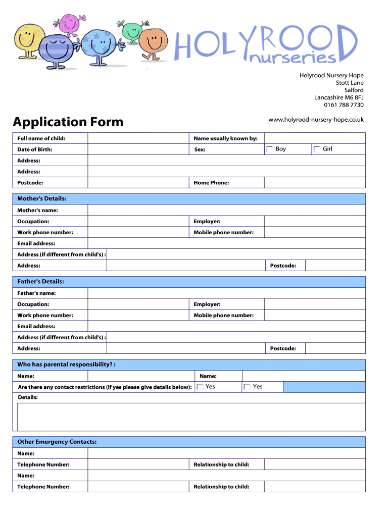 This document serves as an application form for enrolling a child in Holyrood Nursery Hope, collecting necessary personal, contact, medical, and permissions information from parents or guardians.