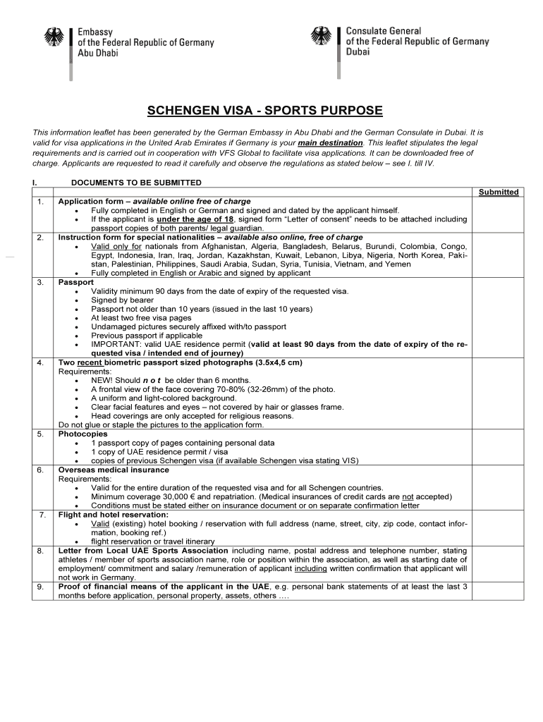 SCHENGEN VISA SPORTS PURPOSE This information leaflet has been generated by the German Embassy in Abu Dhabi and the German Consulate in Dubai. It is valid for visa applications in the United Arab