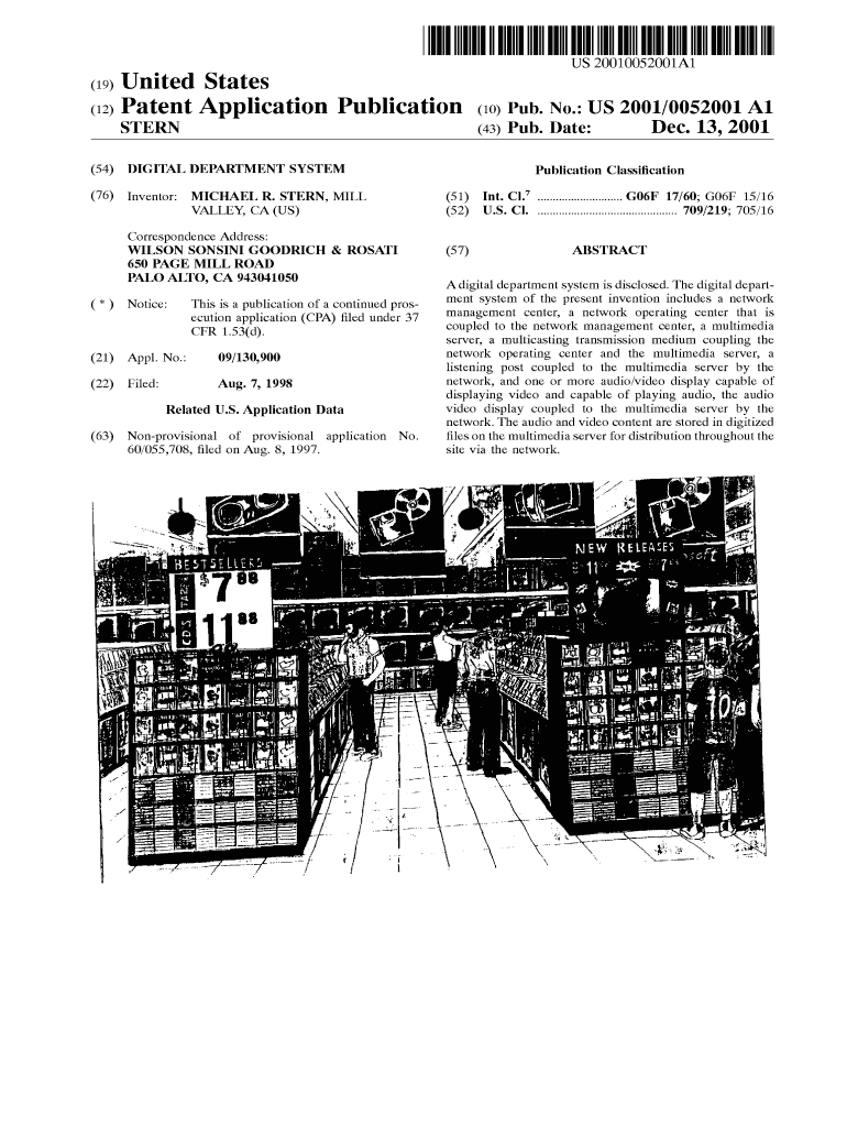 US 20010052001A1 (19) United States (12) Patent Application Publication (10) Pub. No.: US 2001/0052001 A1 (43) Pub. Date: STERN (54) DIGITAL DEPARTMENT SYSTEM (76) Inventor: Dec. 13, 2001 Publication