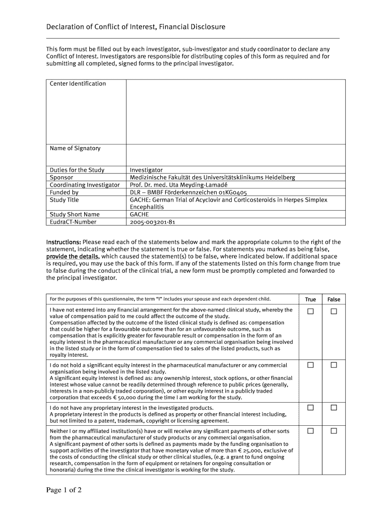 Declaration of Conflict of Interest, Financial Disclosure This form must be filled out by each investigator, subinvestigator and study coordinator to declare any Conflict of Interest. Investigators