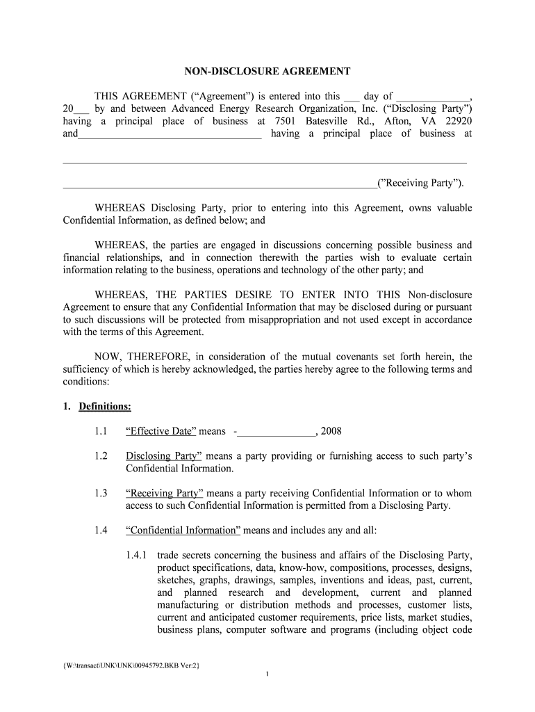 NONDISCLOSURE AGREEMENT THIS AGREEMENT (Agreement) is entered into this day of, 20 by and between Advanced Energy Research Organization, Inc. (Disclosing Party) having a principal place of business