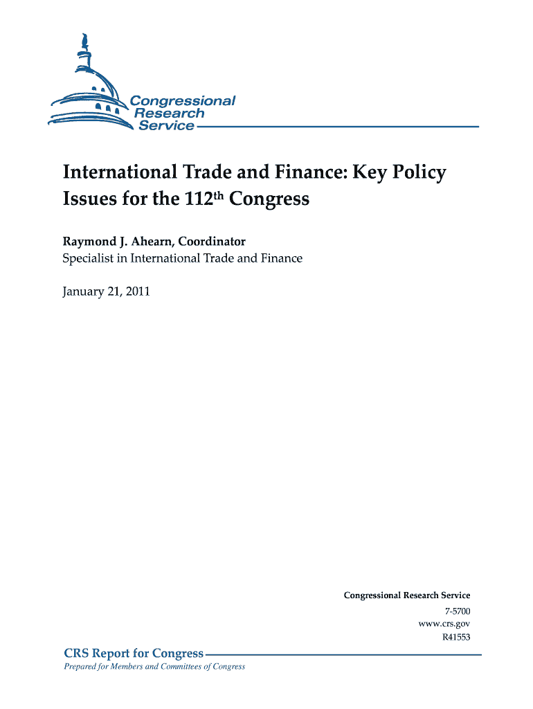 International Trade and Finance: Key Policy Issues for the 112th Congress Raymond J. Ah earn, Coordinator Specialist in International Trade and Finance January 21, 2011, Congressional Research Service