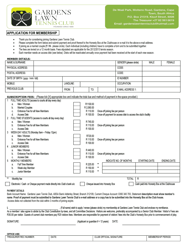 This document serves as a membership application form for the Gardens Lawn Tennis Club, detailing personal information required for membership and subscription fees for various member categories.
