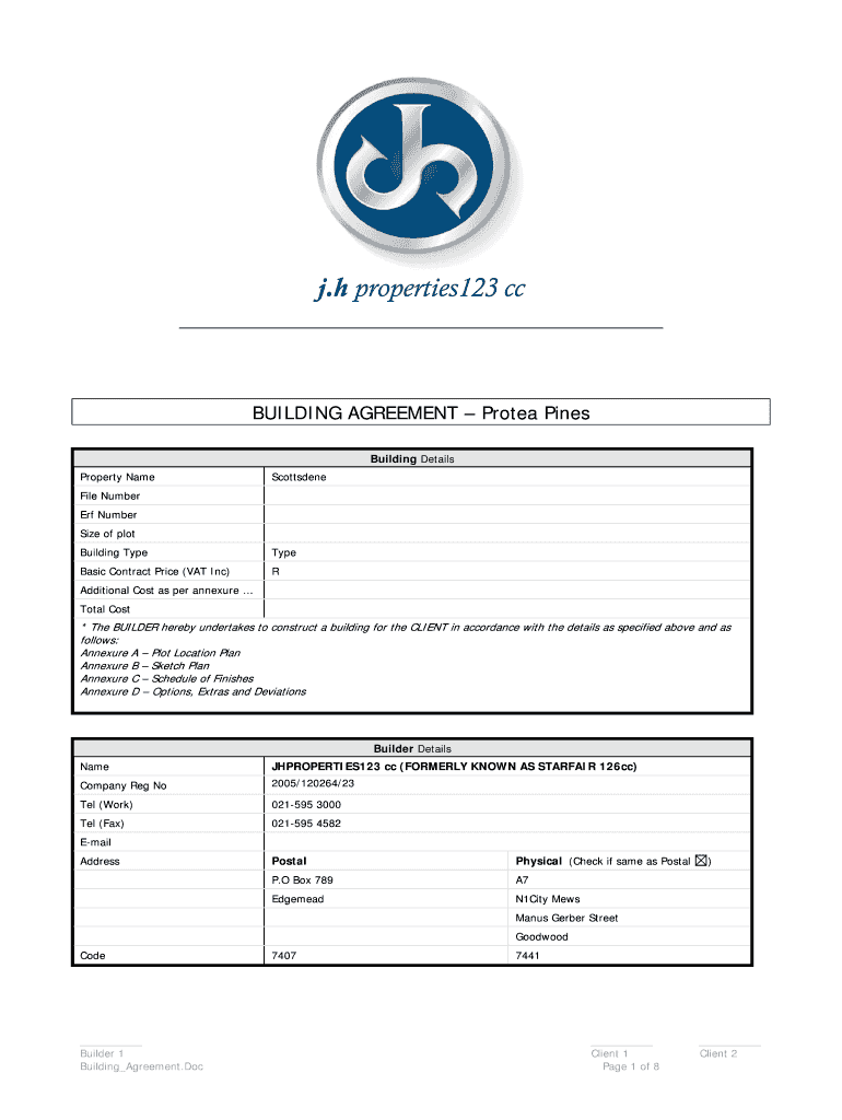 J.h properties123 cc BUILDING AGREEMENT Protean Pines Building Details Property Name Scottsdale File Number ERF Number Size of plot Building Type Basic Contract Price (VAT Inc) R Additional Cost as