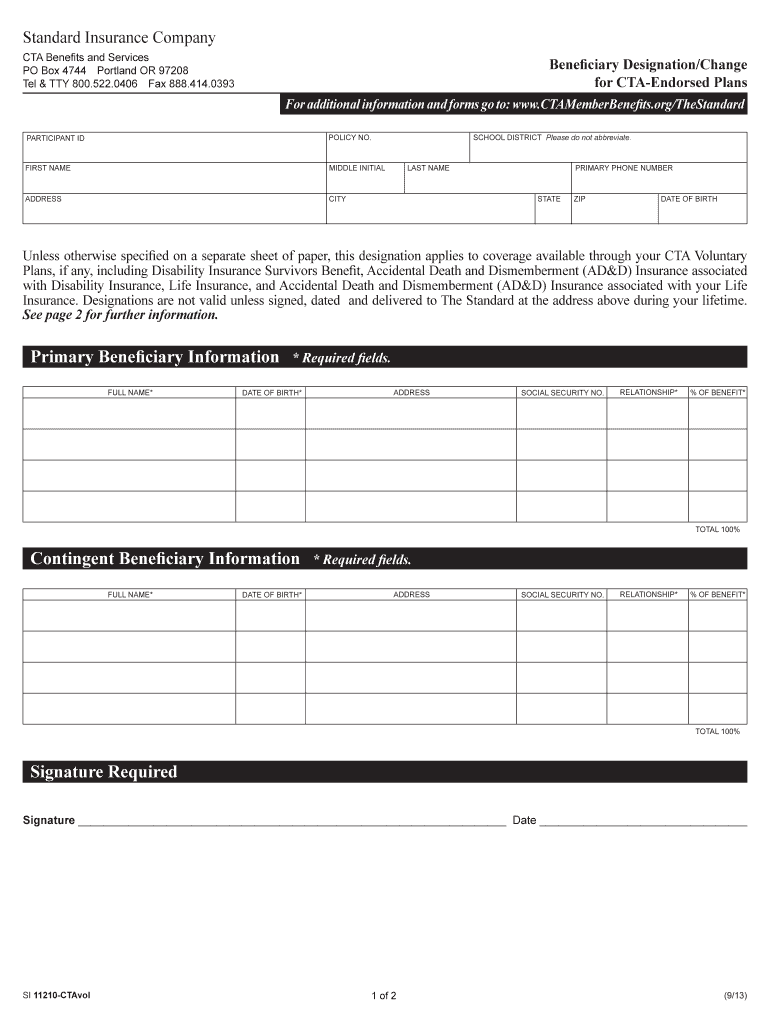 Participants of CTA-endorsed insurance plans are eligible to use this form to designate or change their beneficiaries.