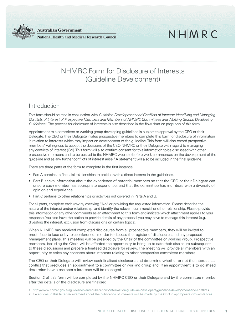 Individuals who are applicants for NHMRC funding, researchers involved in NHMRC funded projects, and members of NHMRC committees are required to file the NHMRC Form for Disclosure of Interests.