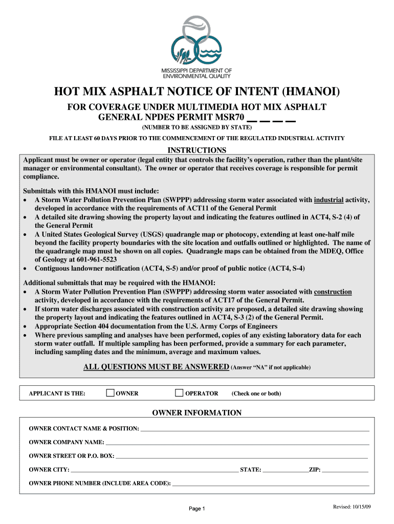 Get the free HOT MIX ASPHALT MULTIMEDIA GENERAL PERMIT MSR70 - deq state ms