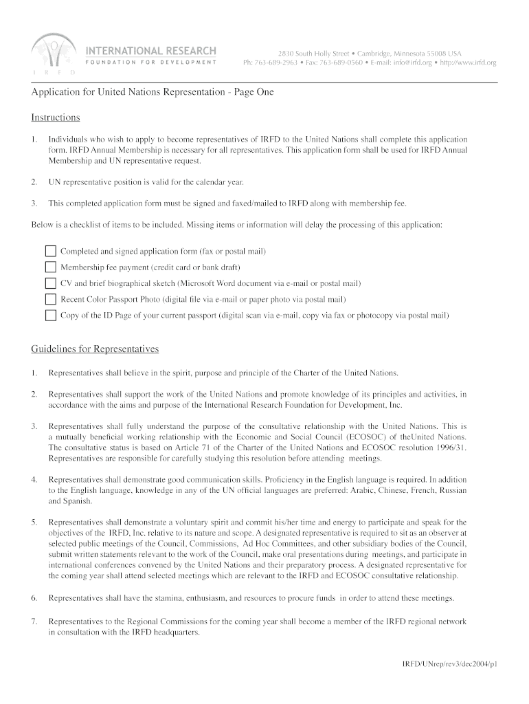 This document serves as an application form for individuals who wish to become representatives of the International Research Foundation for Development (IRFD) to the United Nations, outlining necessary