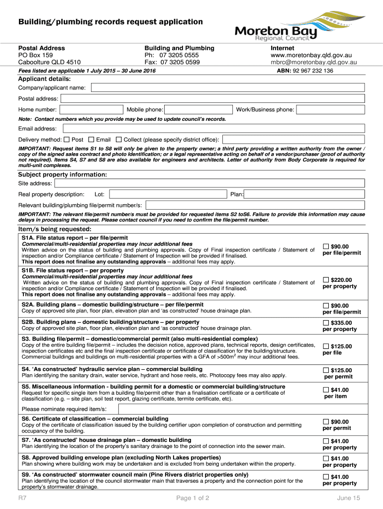 Building/plumbing records request application Postal Address PO Box 159 Caboolture QLD 4510 Building and Plumbing pH: 07 3205 0555 Fax: 07 3205 0599 Internet www.moretonbay.qld.gov.au Marc moretonbay.QLD.gov.AU