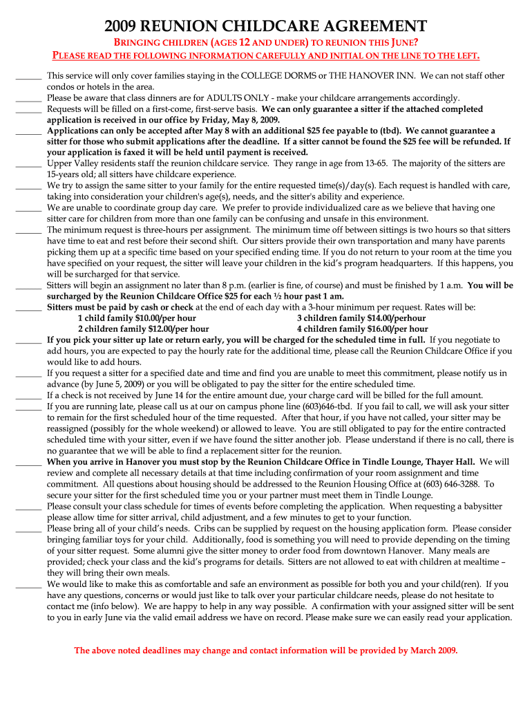 Get the free Child Care Agreement Form - alumni dartmouth
