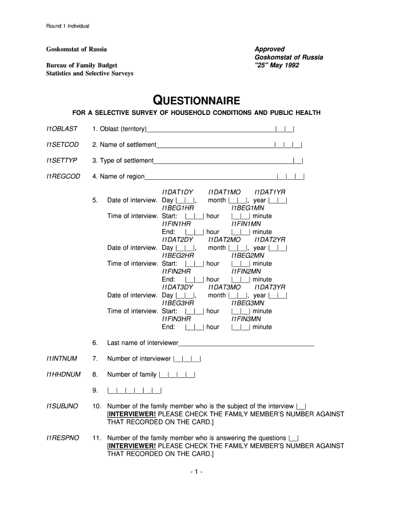 Field-by-Field Instructions for the Russian Household Conditions Survey