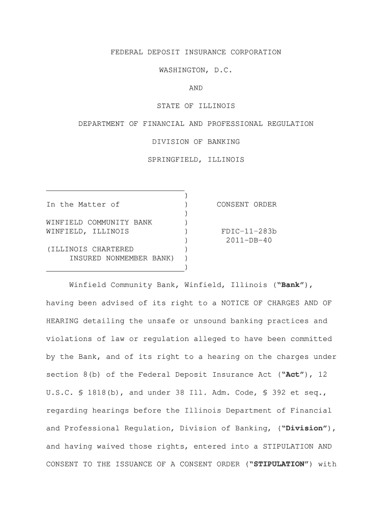FEDERAL DEPOSIT INSURANCE CORPORATION WASHINGTON, D.C. AND STATE OF ILLINOIS DEPARTMENT OF FINANCIAL AND PROFESSIONAL REGULATION DIVISION OF BANKING SPRINGFIELD, ILLINOIS In the Matter of WINFIELD