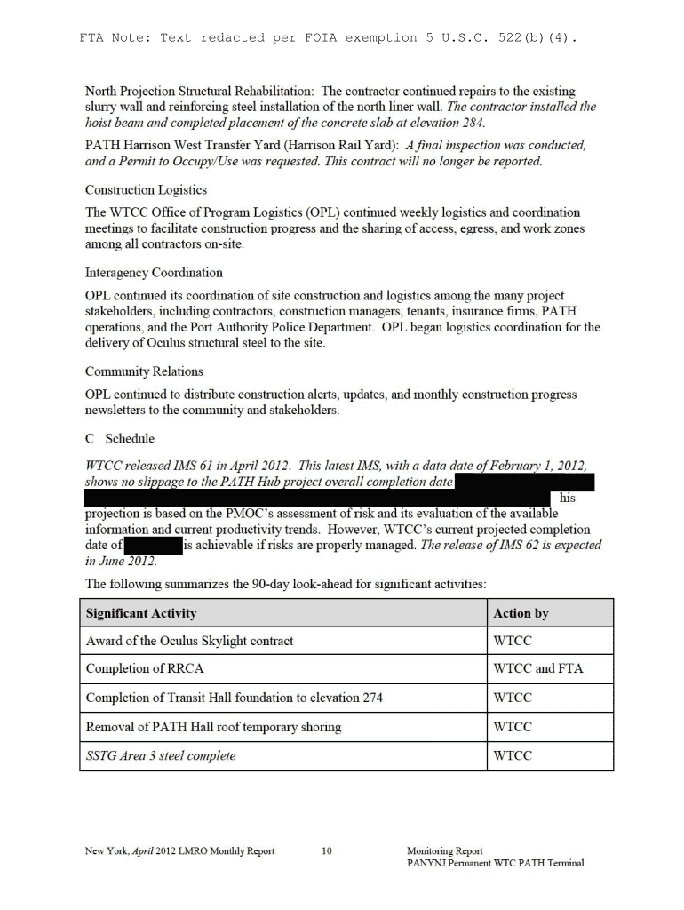 MONTHLY MONITORING REPORT World Trade Center Port Authority TransHudson Terminal PORT AUTHORITY OF NEW YORK AND NEW JERSEY New York, New York April 2012 PMC Contract Number: DTFT6009D00008 Task Order