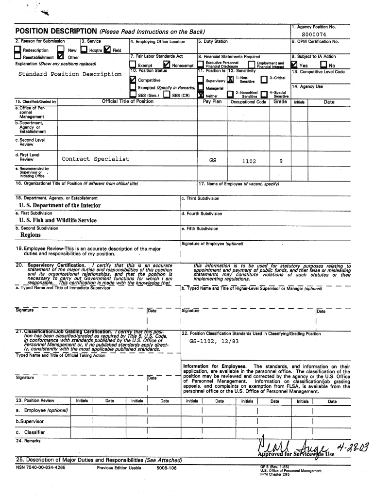 Contract Specialist GS11029 A. INTRODUCTION The purpose of this position is to serve as a Contract Specialist for the US Fish & Wildlife Service with responsibility for performing professional work