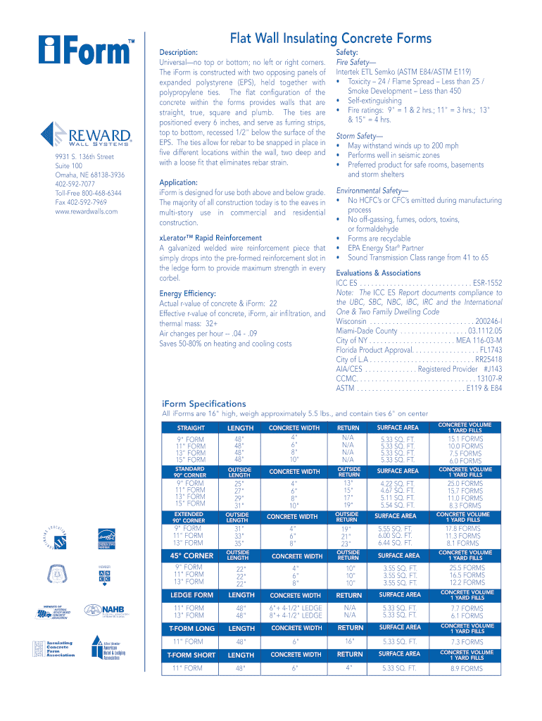 Flat Wall Insulating Concrete Forms 9931 S. 136th Street Suite 100 Omaha, NE 681383936 4025927077 Toll-free 8004686344 Fax 4025927969 www.rewardwalls.com Description: Universal no top or bottom; now