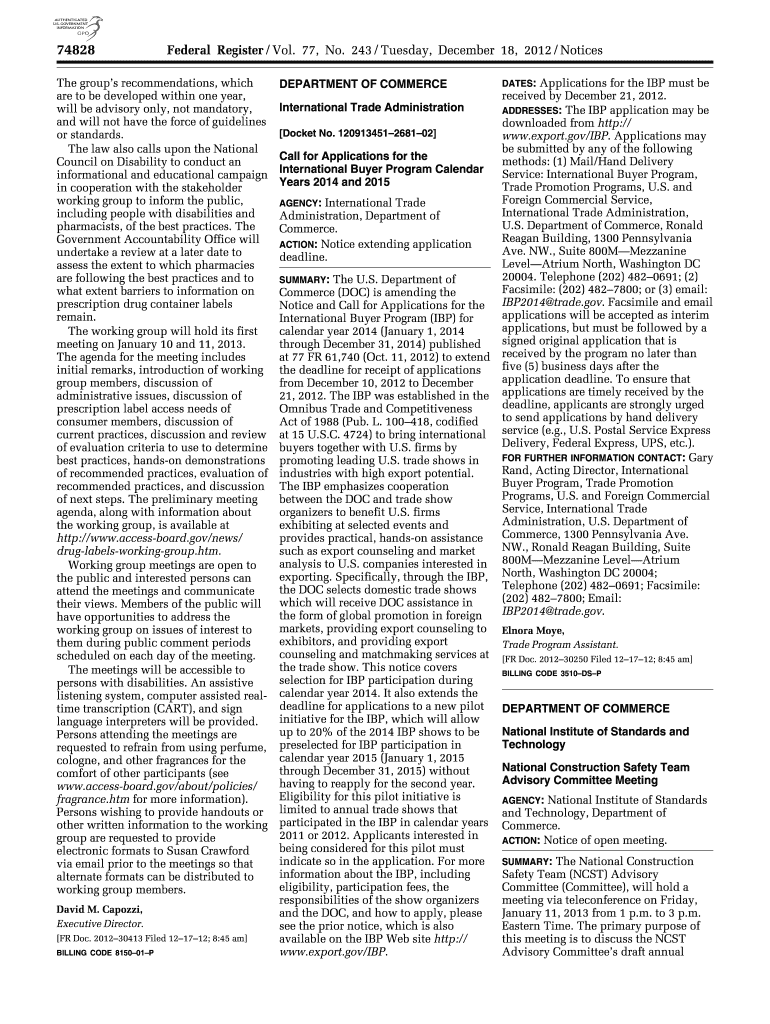 McDonald on DSK67QTVN1PROD with 74828 Federal Register / Vol. 77, No. 243 / Tuesday, December 18, 2012 / Notices The group s recommendations, which are to be developed within one year, will be advisory