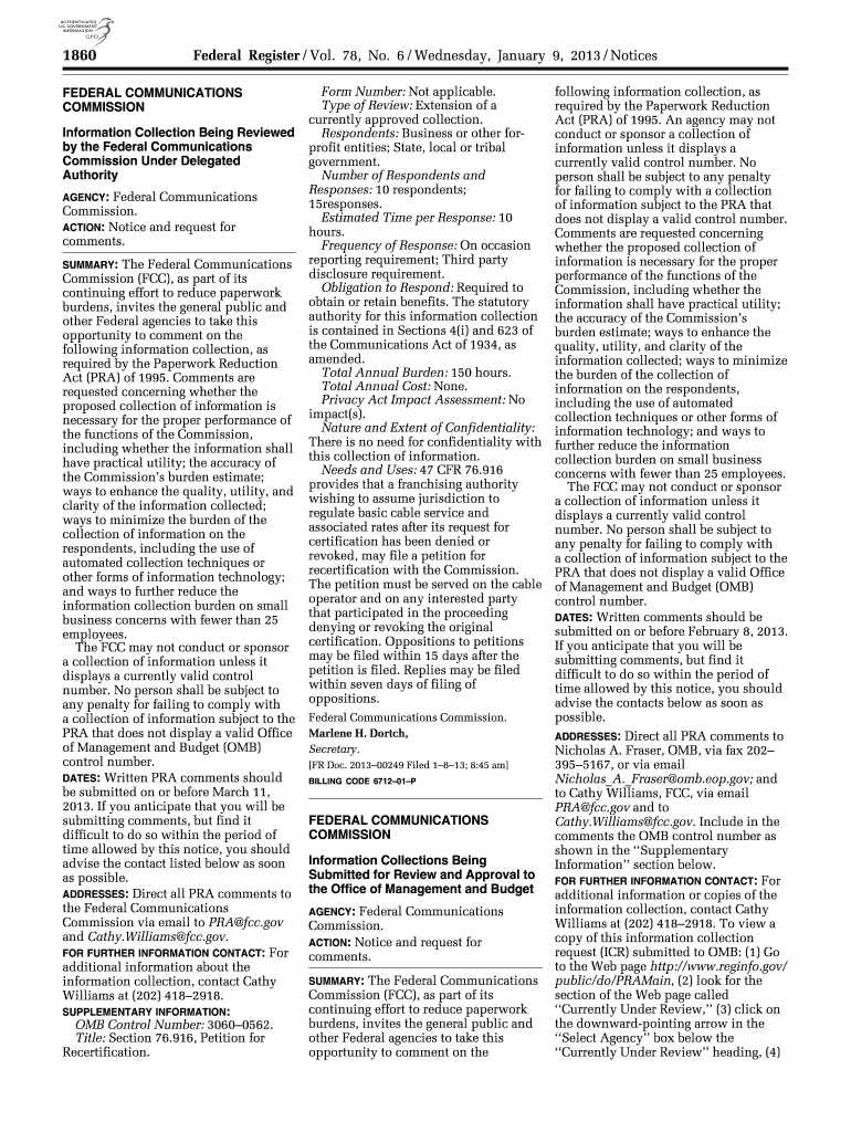 1860 Federal Register / Vol. 78, No. 6 / Wednesday, January 9, 2013 / Notices FEDERAL COMMUNICATIONS COMMISSION Information Collection Being Reviewed by the Federal Communications Commission Under
