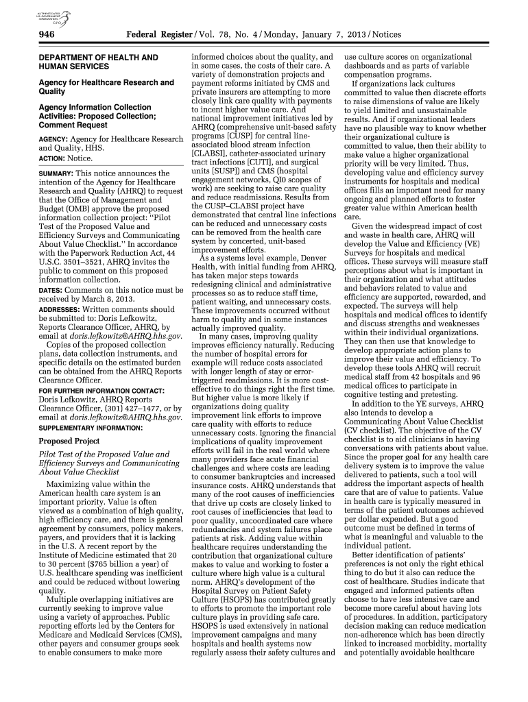 946 Federal Register / Vol. 78, No. 4 / Monday, January 7, 2013 / Notices DEPARTMENT OF HEALTH AND HUMAN SERVICES Agency for Healthcare Research and Quality Agency Information Collection Activities: