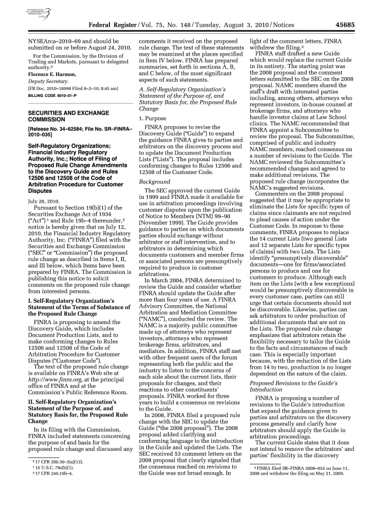 Federal Register / Vol. 75, No. 148 / Tuesday, August 3, 2010 / Notices NYSEArca201069 and should be submitted on or before August 24, 2010. For the Commission, by the Division of Trading and Markets,