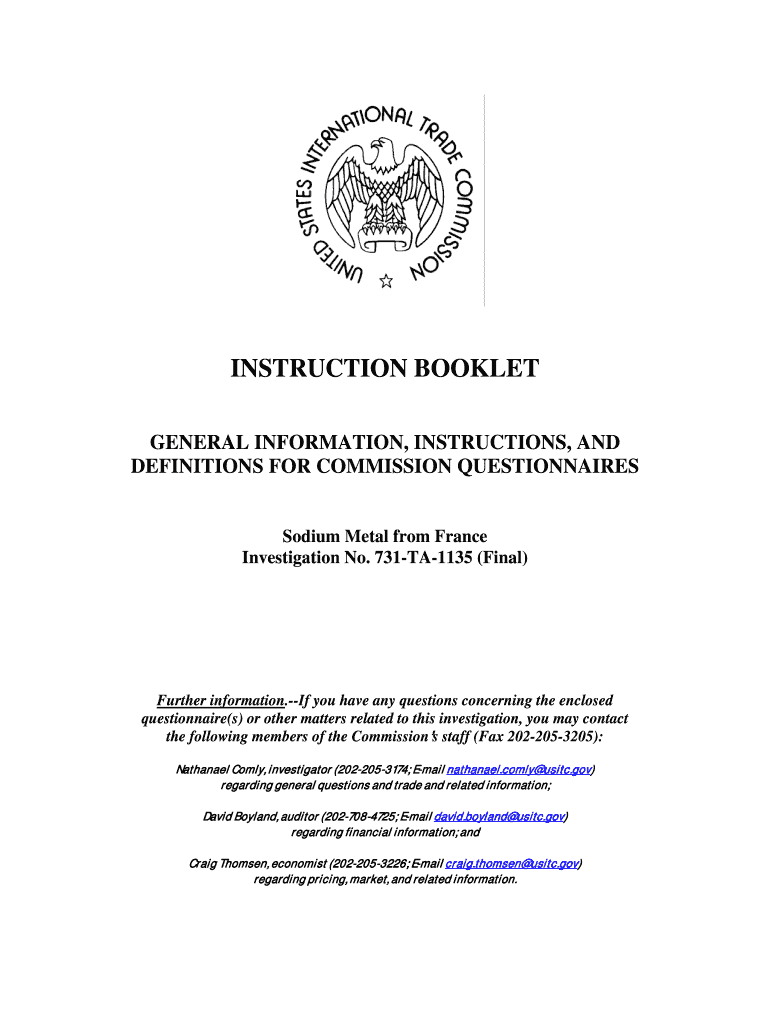 This document provides instructions, definitions, and general information pertaining to the investigation of Sodium Metal from France, including how to complete and submit questionnaires related to