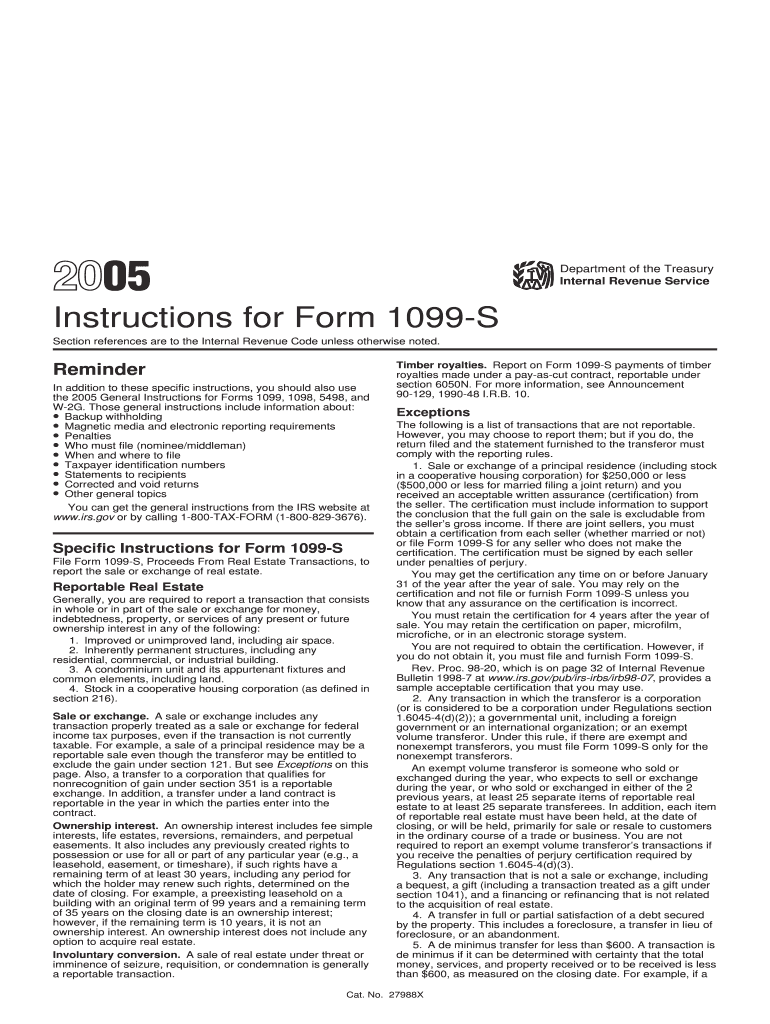 The Instructions for Form 1099-S serve as a vital resource in reporting proceeds from real estate transactions. This form is essential for any individual or entity engaged in selling real estate, as it ensures accurate tax reporting in compliance with IRS regulations. The form outlines the necessary procedures for filing, including identification of both individuals and organizations that must participate in these transactions.