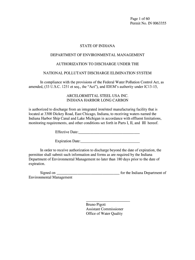 This document serves as a permit for ArcelorMittal Steel USA Inc. to discharge wastewater from their integrated iron/steel manufacturing facility into the Indiana Harbor Ship Canal and Lake Michigan,