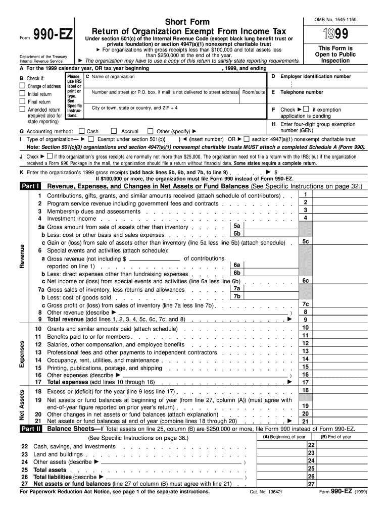 Purpose of Form Form 990, Return of Organization Exempt From Income Tax, and Form 990-EZ are used by tax-exempt organizations, nonexempt charitable trusts (that are not treated as private foundations), and section 527 political organizations to provide the IRS with the information required by section 6033.