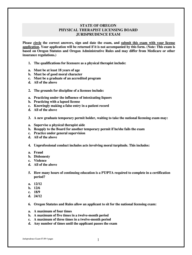 This document serves as a jurisprudence examination for physical therapist licensure in Oregon, requiring applicants to answer questions related to Oregon Statutes and Administrative Rules concerning