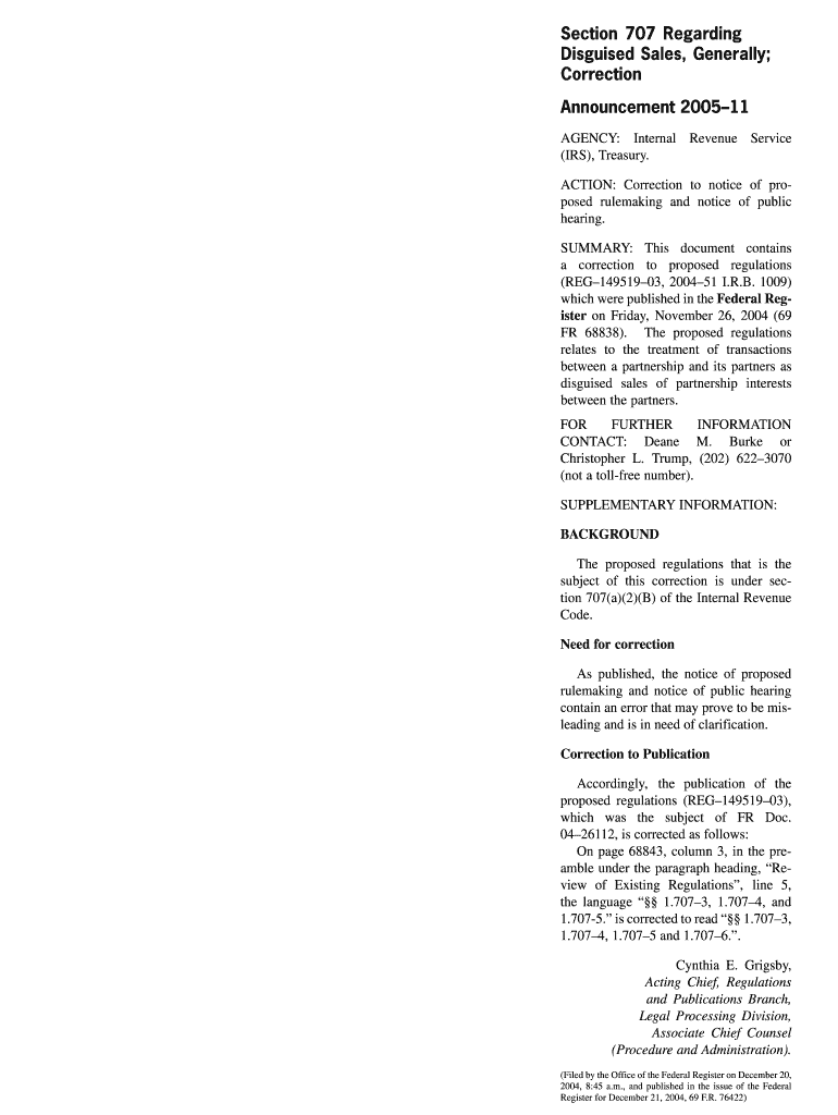 Get the free Announcement 2005-11 - Section 707 Regarding Disguised Sales, Generally; Correction....