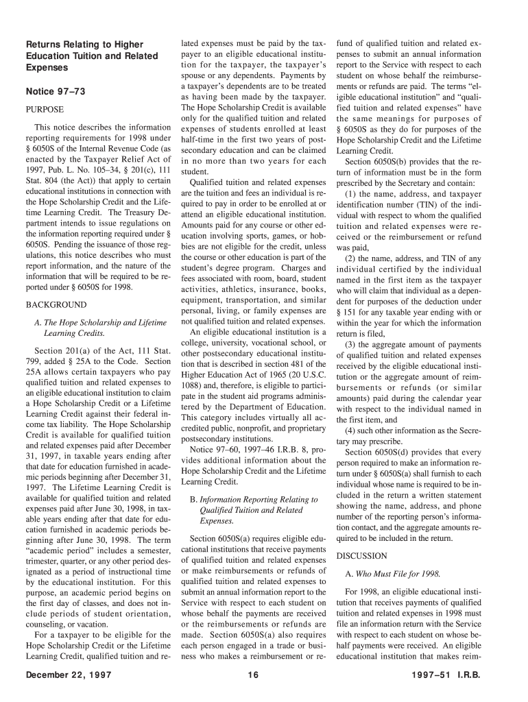 Notice 97–73 is an IRS notice that provides guidance on the reporting requirements for certain types of compensation and benefits during a tax year.