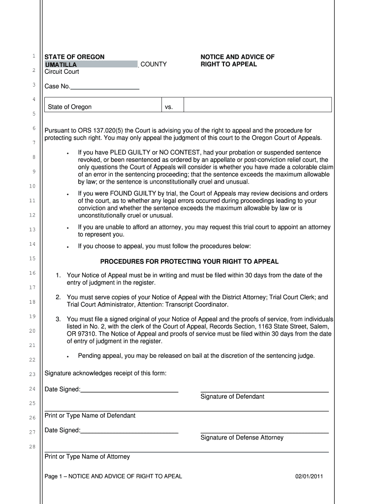 Get the free NOTICE AND ADVICE OF RIGHT TO APPEAL - courts oregon