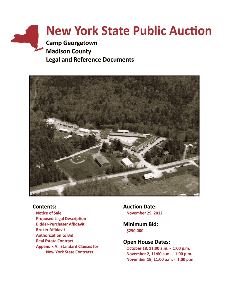 New York State Public AUC on Camp Georgetown Madison County Legal and Reference Documents Contents: No CE of Sale Proposed Legal Describe on BidderPurchaser Davit Broker Davit Authorize on to Bid