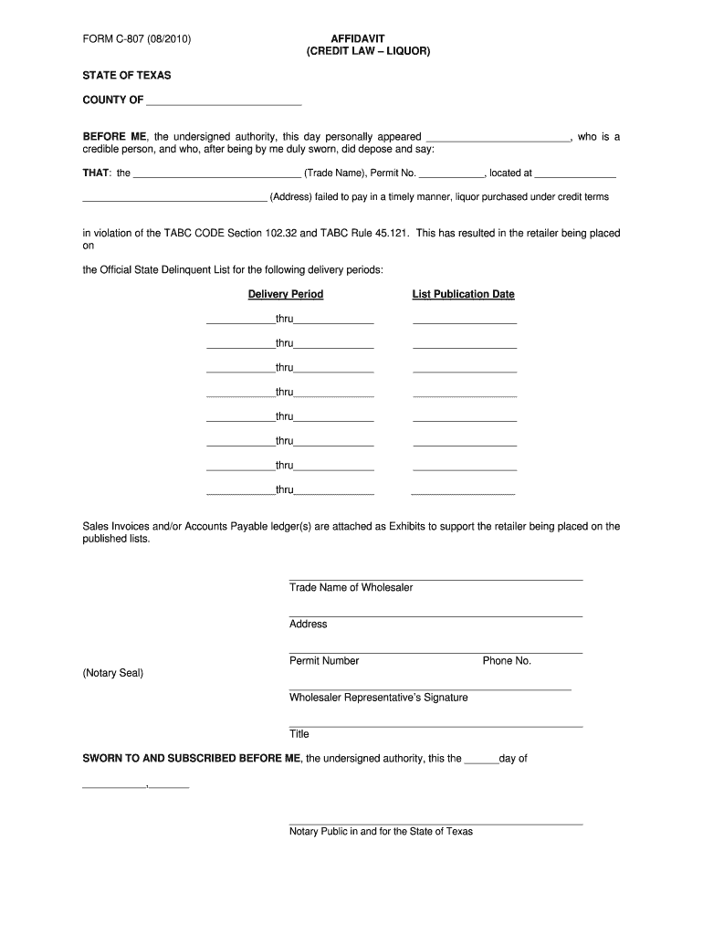 Get the free FORM C-807 (08/2010) - tabc state tx